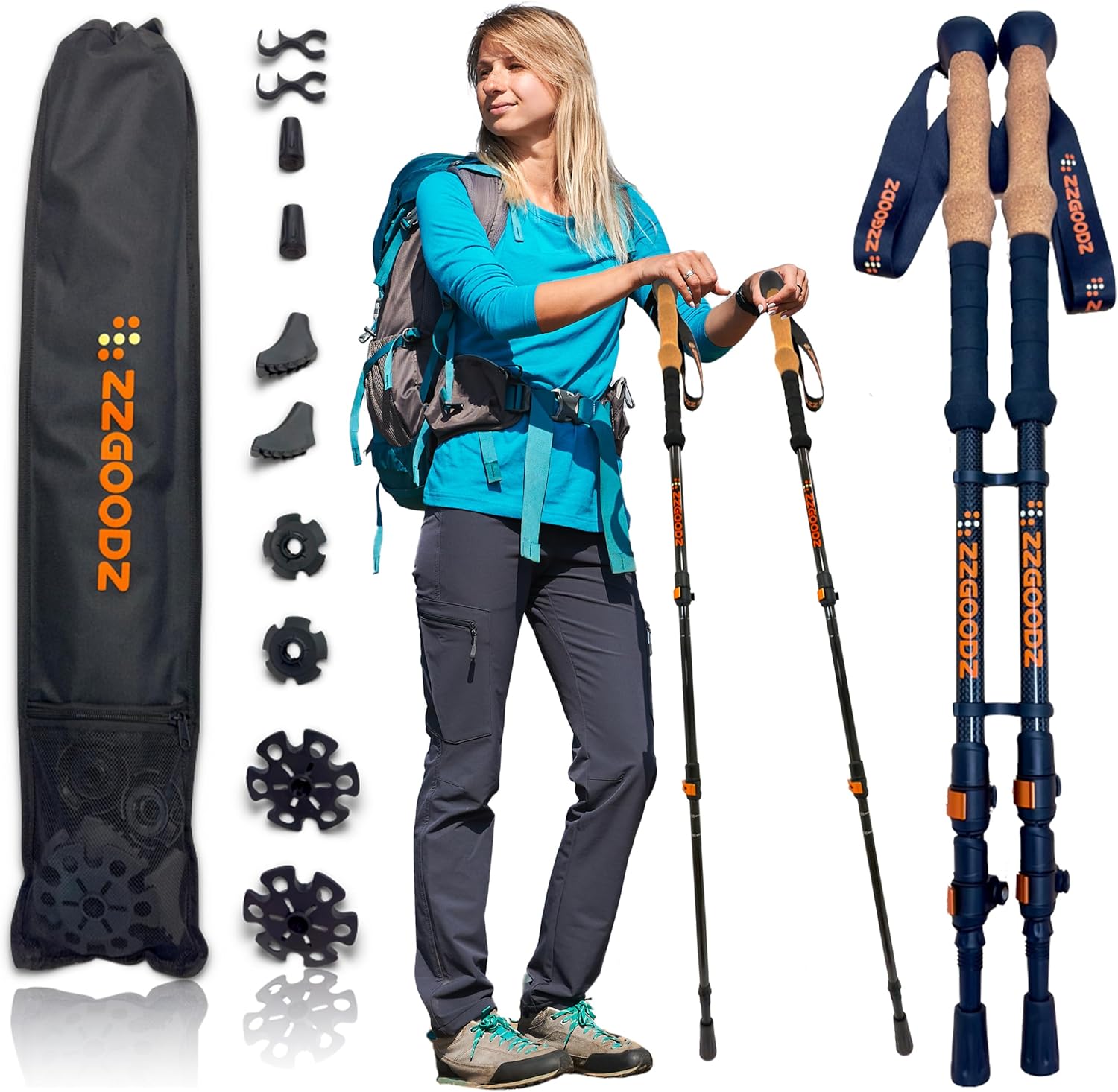 Collapsible Hiking & Trekking Poles 2 pc – Ultralight Folding Walking Sticks for Seniors, Women and Men-Adjustable Hiking Sticks with Metal Folding Clasps, Cork Handle and Silky Wristband